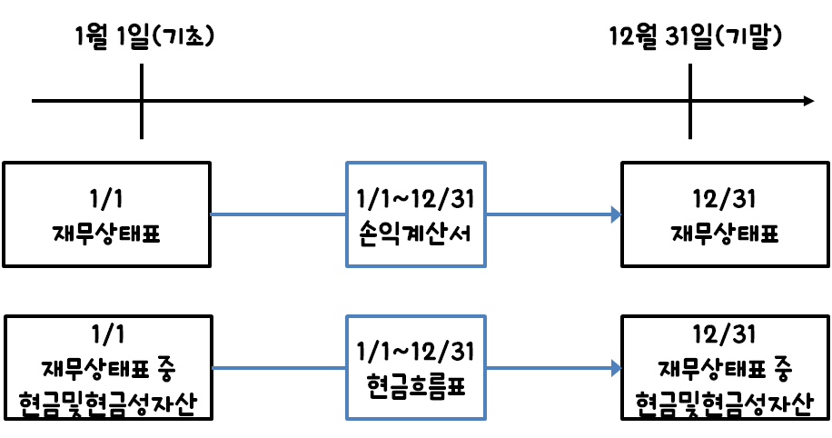 기초의 재무상태표에서 일정 기간(1년이라 한다) 동안 경영성과를 담은 손익계산서가 최종적으로 기말의 재무상태표에 반영된다.
