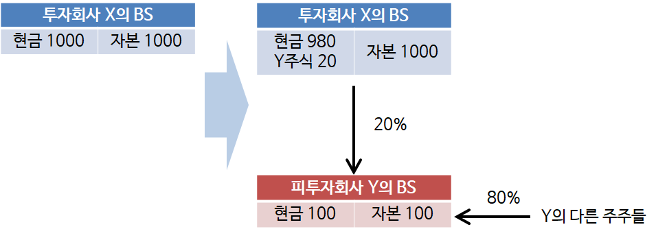 회사X는 최초에 현금 1000원을 가지고 있다가 이중 20원을 써서 회사Y 발행 주식을 취득했다.