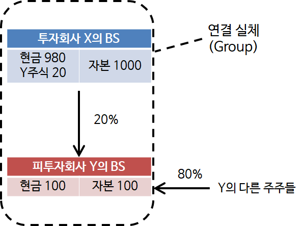 1. 회사X가 취득한 회사Y 주식은 없는 것이고(내가 나한테 주식을 발행하고 내가 산 꼴이므로), 연결실체 외부(Y의 다른 주주들)로부터 들어온 돈 80원(= 회사Y의 자본 100원 X 회사Y의 다른 주주들 몫 80%)은 연결실체의 자본을 구성한다.