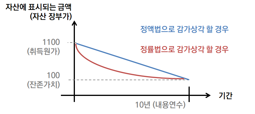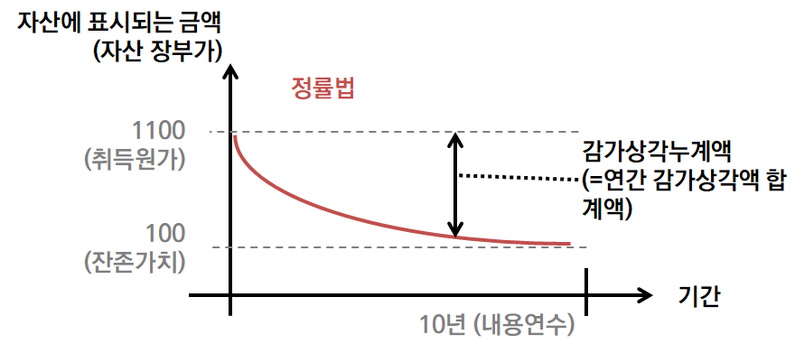 위 취득원가 1100원짜리 유형자산을 잔존가치 100원으로 하고, 10년의 내용연수를 적용하여, 정률법으로 감가상각하면, 매년 감가상각하는 금액이 점점 줄어들게 된다.