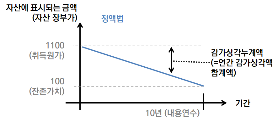 위와 같이 매년 일정한 금액을 줄여나가는 감가상각 방법을 "정액법(Straight-line Method)"이라고 한다.