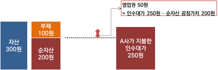 영업권은 을사의 순자산공정가치(200원)보다 을사를 취득하기 위해 지불한 돈(250원)과의 차액인데,